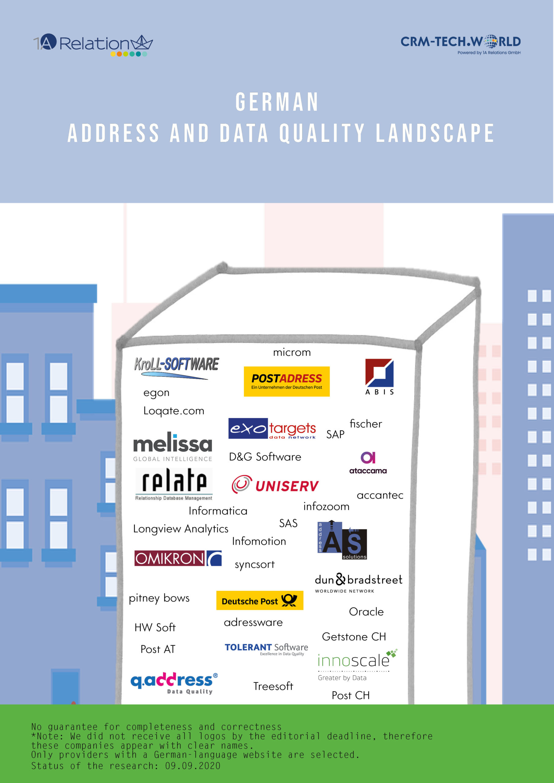 - Enrichment: Address data/vendor data: Deutsche Post Direkt, Melissa Data, Bisnode, Creditreform, Jaroso