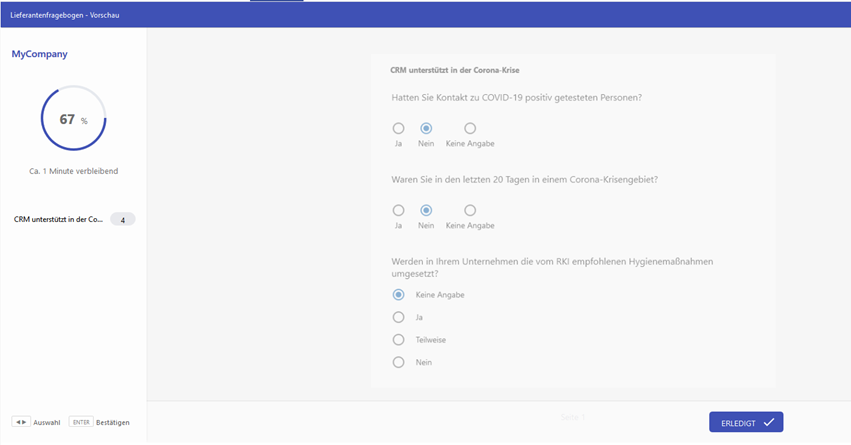 Stefan-Markus Eschner: Against the background of the corona pandemic, our survey module can be used to protect employees, for example at suppliers. They were asked, for example, what their corona measures were. The tool is also suitable for quick internal employee surveys, e.g. do employees belong to the risk group or questions on “What do you need most urgently right now? Within a short time, the management team thus had a clear picture to decide on appropriate measures.