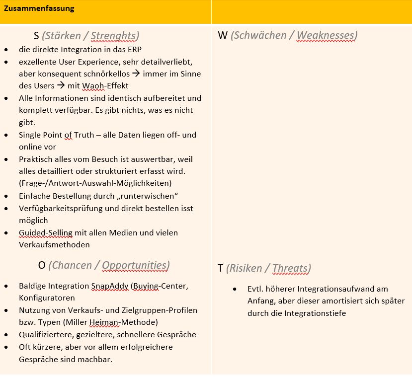 - Transparenz für die Kollegen, was gesprochen, gezeigt, abgelehnt und bestellt wurde