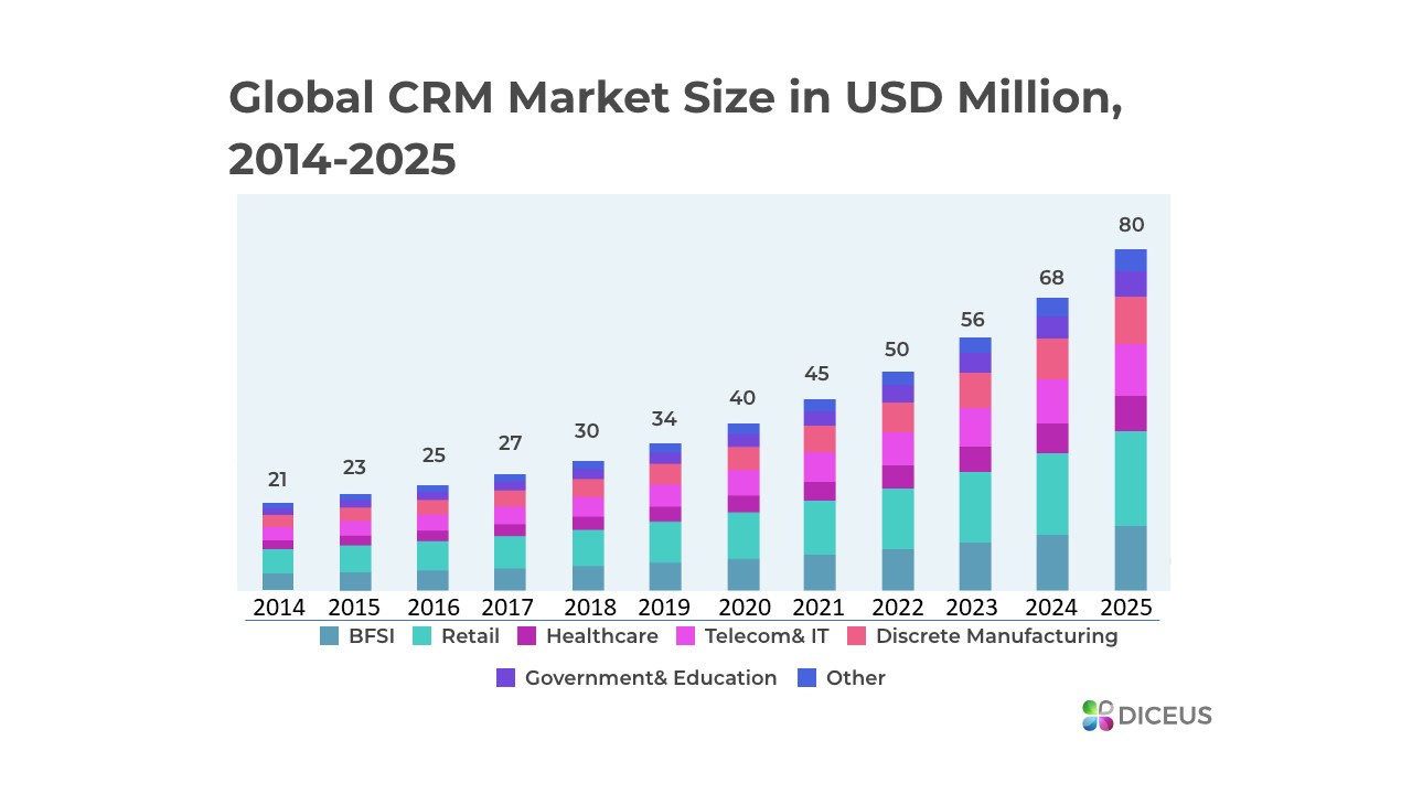 Der weltweite Umsatz für Enterprise Application Software prognostiziert Gartner auf mehr als $193.6 Mrd. im Jahr 2018, ein Anstieg um 12.5 % von 2017, damals lag der Wert bei $172.1 Mrd. CRM schneidet sich somit knapp 25 % des gesamten Enterprise Software Market heraus.