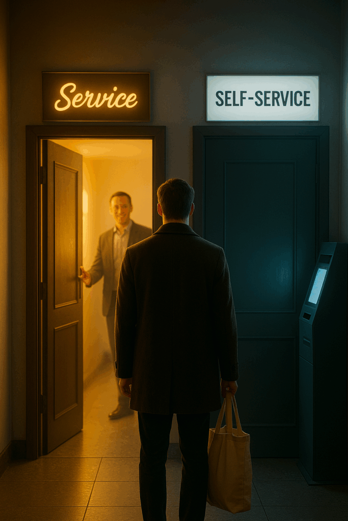 Selbstbedienung spart Löhne, aber sie kostet Beziehungen. Sie ersetzt persönliche Begegnung durch Bildschirme, Chats und Agenten sowie Dialog durch Pieptöne, Avatare und eisige Stimmen.