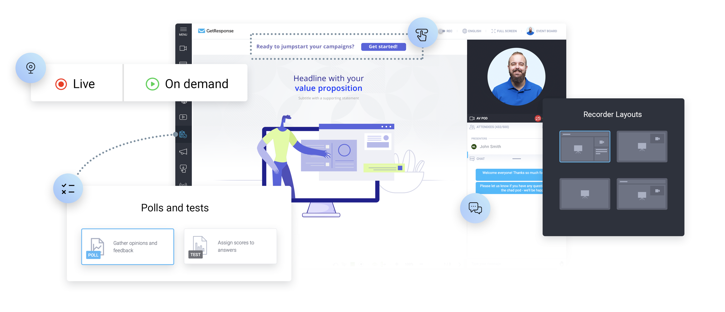 Im Webinar ist es möglich einen Live-Stream über YouTube oder Facebook zu starten. Um auf Sonderangebote auf der Landingpage aufmerksam zu machen, setzte der Webinarleiter einen Call-to-Action-Button ein. So ist eine sofortige Response möglich. GetResponse eben! So geht es – Deep Dive zu: Webinare erstellen, die mit der E-Mail Liste und Anmeldeformularen auf einer Landing Page und oder Newsletter verbunden werden: https://www.getresponse.com/de/funktionen/webinar-software