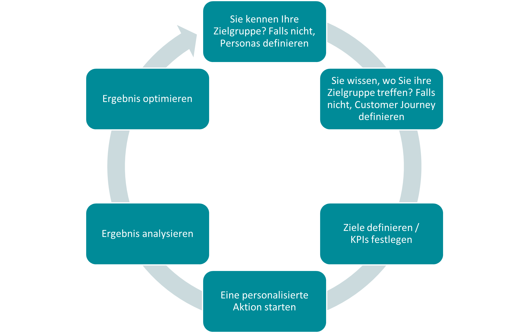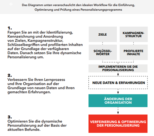 Es ergibt sich ein wiederkehrender Kreislauf: Durch die Personalisierung ergibt sich – wie oben beschrieben – eine höhere Interaktionsrate. Damit erhalten Sie neue Daten und können auf dieser Basis dieser Informationen die Personas und Customer Journey schärfen und für die nächste Maßnahme nutzen.